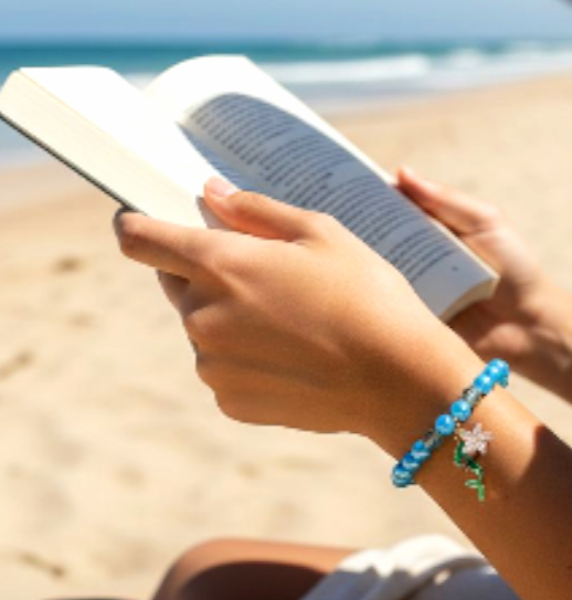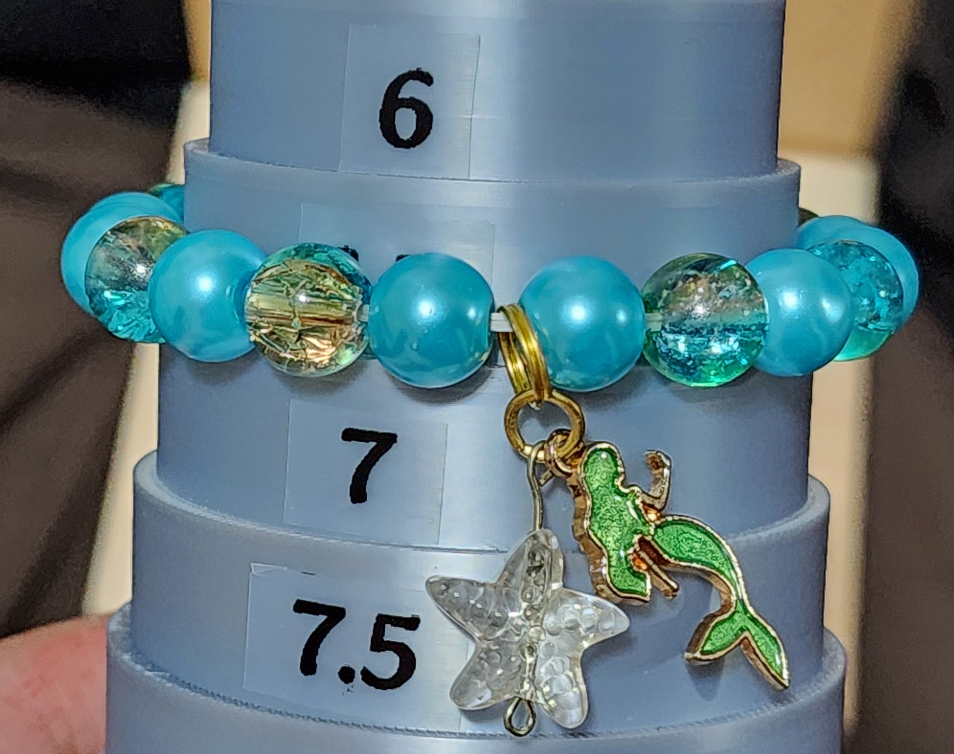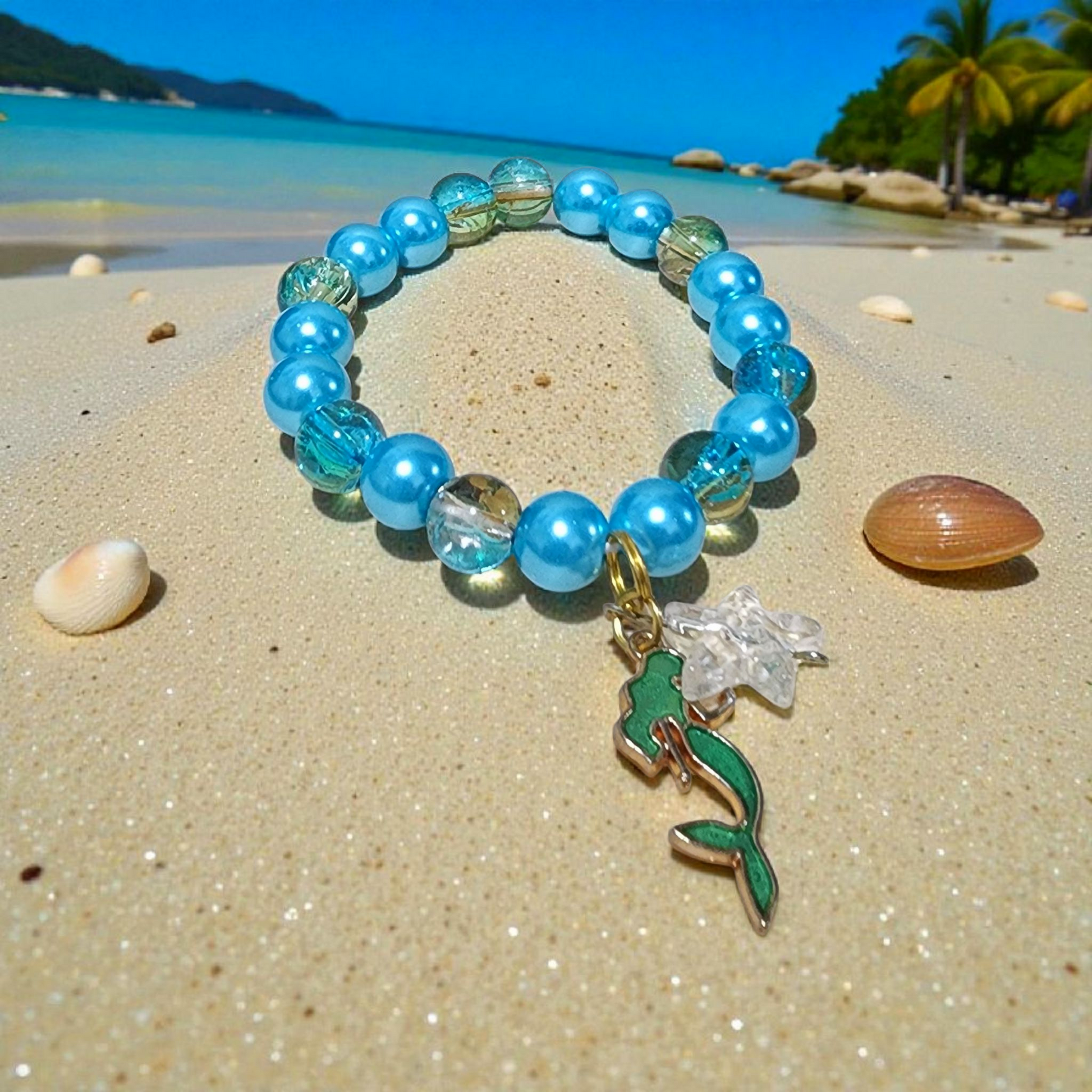 From the quiet depths of Aquata’s ocean realm comes the Aquatic Grace Bracelet.Cool-toned beads in seafoam, crystal, and deep blue shimmer like sunlight dancing beneath the waves. A sculpted mermaid charm glides beside a translucent star, echoing Aquata’s love of swimming and her serene strength. This bracelet is a tribute to fluid motion, inner calm, and the quiet power of the sea.