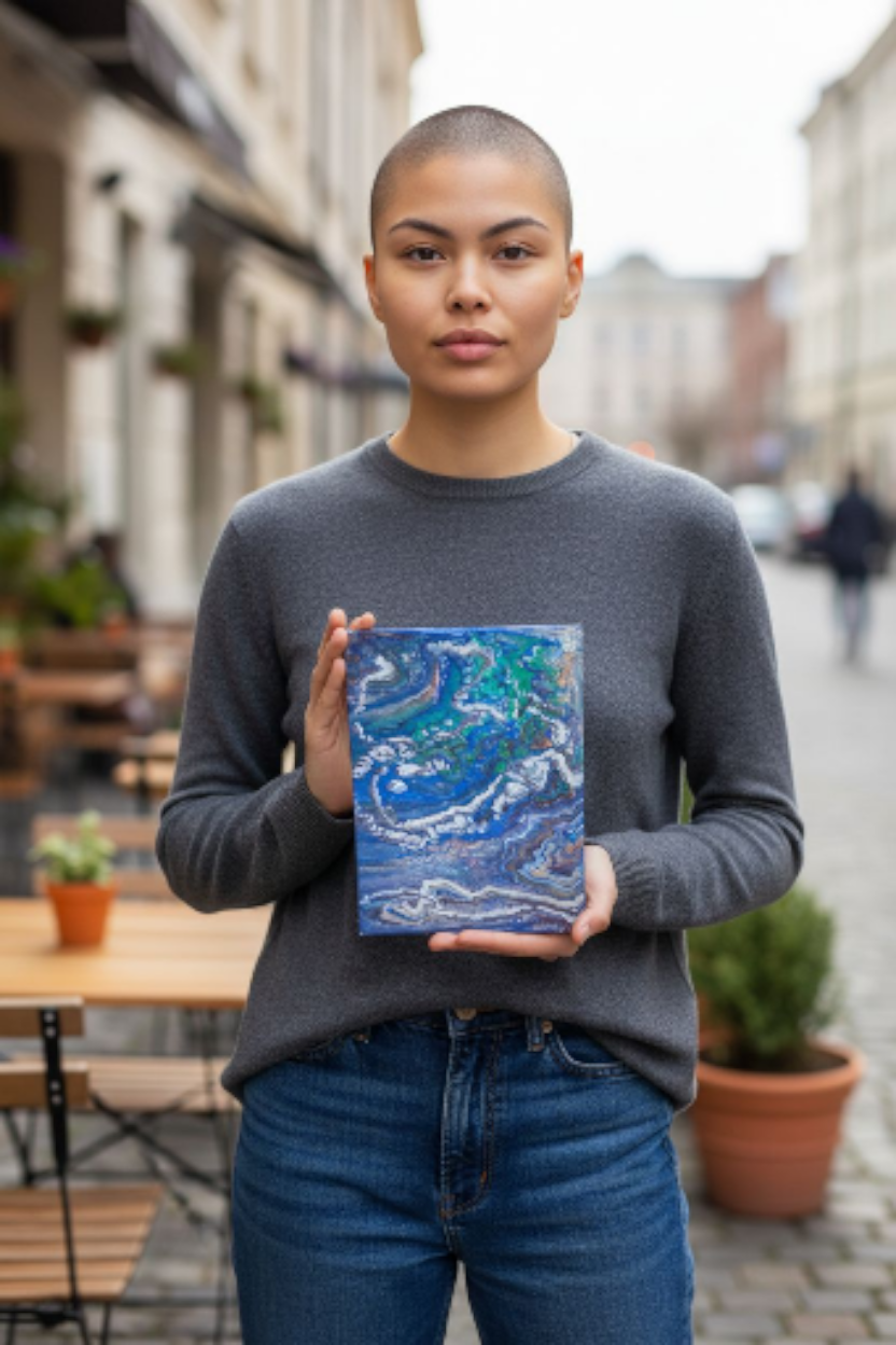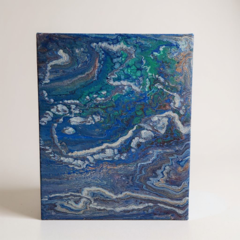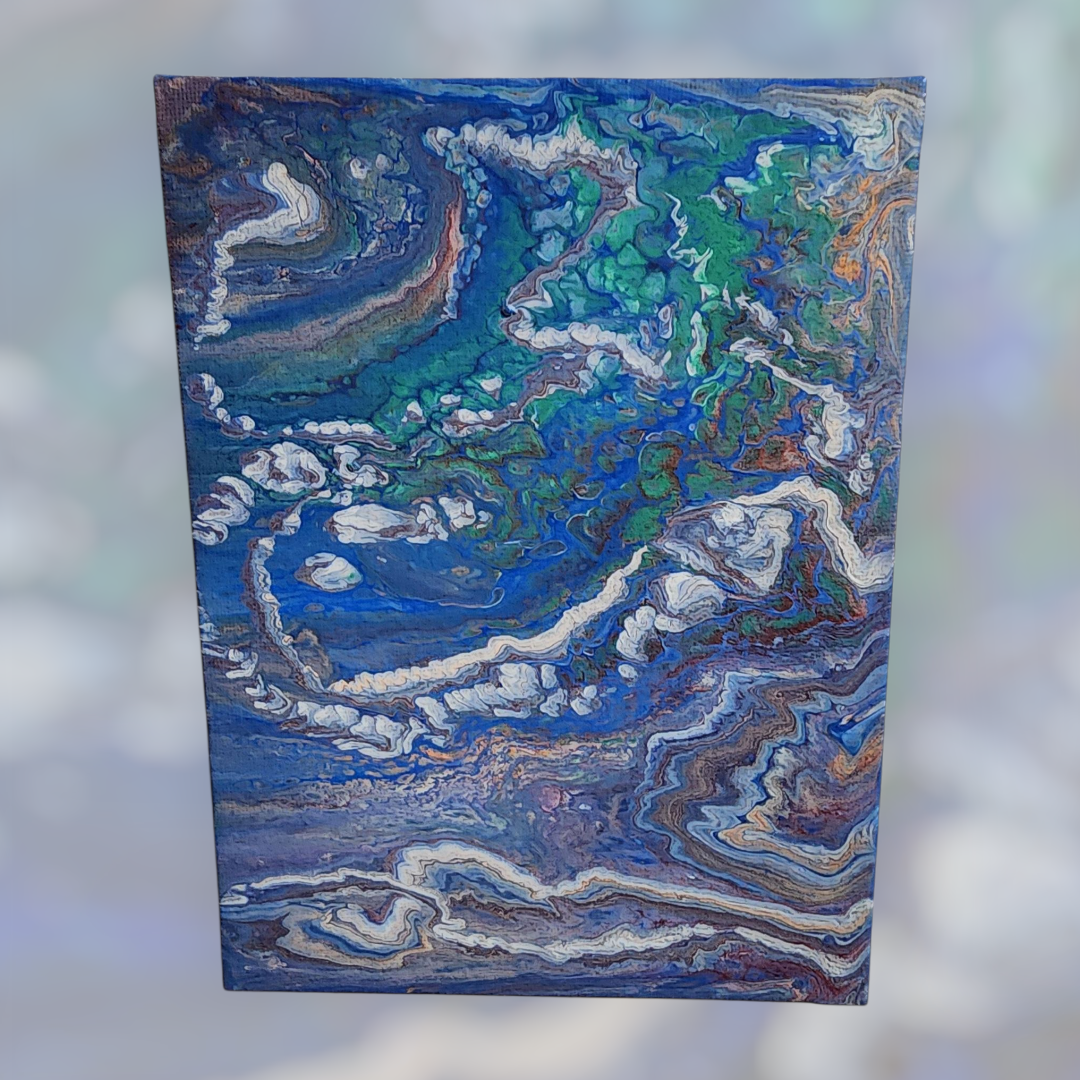 Stratosphere captures the awe-inspiring beauty of our planet as seen from the edge of space. This original 4in x 6in acrylic pour painting evokes the swirling blues of oceans, the soft whites of cloud cover, and the rich greens and ochres of landmasses—all blending together in a mesmerizing, fluid composition. The organic patterns mimic satellite imagery and aerial landscapes, offering a dreamlike glimpse of Earth’s natural rhythms from a celestial vantage point.